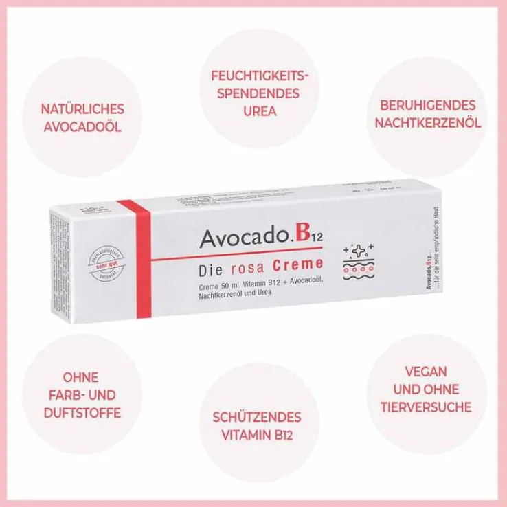 - Vitamin B12 gilt als antioxidativ wirkendes Vitamin, das sich bei Juckreiz und Rötungen bewährt hat. Zusätzlich schenkt es der Avocado.B12 Creme die charakteristische rosa Farbe.