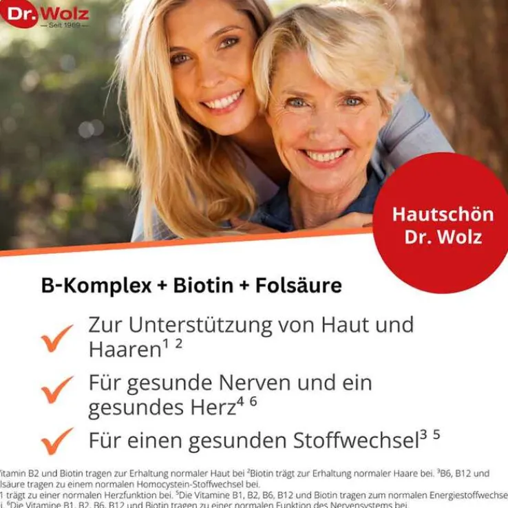 Das Vitamin Biotin regt den Hautstoffwechsel an und ist gut für gesunde Haare. Daher helfen die B-Komplex + Biotin +Folsäure Hefetabletten Dr. Wolz, eine ausreichende Versorgung mit diesen gesunden Vitaminen zu sichern. Die natürliche Hefe ergänzt den Vitaminkomplex ausgezeichnet