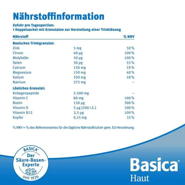 * Kupfer trägt zur Erhaltung von normalem Bindegewebe bei. Kupfer trägt zu einer normalen Hautpigmentierung bei. Vitamin C trägt zu einer normalen Kollagenbildung für eine normale Funktion der Haut bei. Vitamin C und Selen tragen dazu bei, die Zellen vor oxidativem Stress zu schützen. Zink, Calcium, Magnesium und die Vitamine B12 und D haben eine Funktion bei der Zellteilung. Calcium hat eine Funktion bei der Zellteilung und -spezialisierung Zink trägt zu einem normalen Säure-Basen-Stoffwechsel bei. Biotin trägt zur Erhaltung normaler Haut bei.