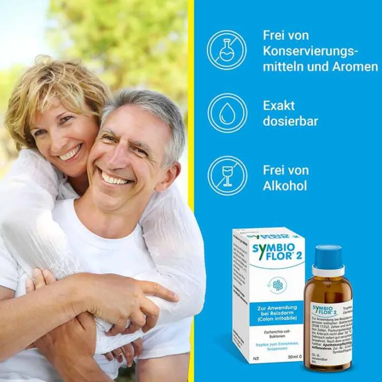 Symbioflor® 2 Tropfen zum Einnehmen, Suspension Wirkstoff: Escherichia coli-Bakterien Anwendungsgebiete: Reizdarmsyndrom (Colon irritabile). Zu Risiken und Nebenwirkungen lesen Sie die Packungsbeilage und fragen Sie Sie Ihre Ärztin, Ihren Arzt oder in Ihrer Apotheke.
