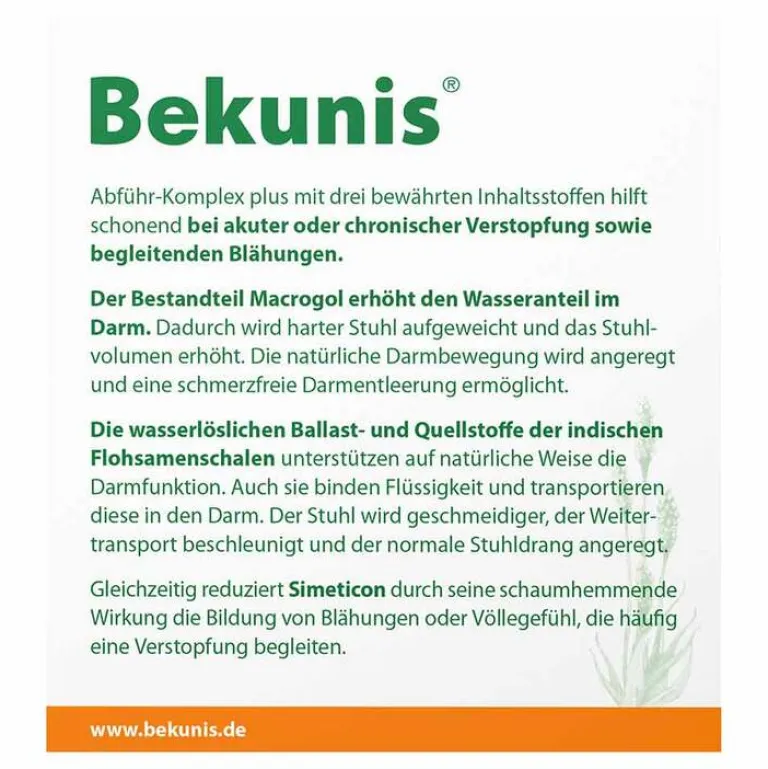 Verwenden Sie Bekunis Abführ-Komplex plus nicht bei: Durchbruch, Verschluss, Verengung oder Lähmung des Darms – Entzündlichen Darmerkrankungen (z. B. Morbus Crohn, Colitis ulcerosa) – Bekannter Überempfindlichkeit gegen einen oder mehrere Bestandteile des Produkts. Es liegen keine Erfahrungen zur Einnahme während der Schwangerschaft und Stillzeit vor, daher sollte Bekunis Abführ-Komplex plus in diesem Fall bei Bedarf nur auf ärztlichen Rat hin eingenommen werden. Für Patienten mit Nierenfunktionsstörungen ist keine Dosisanpassung erforderlich. Das Produkt bis zur Besserung der Symptome verwenden. Bei hartnäckiger und/oder chronischer Verstopfung kann eine wiederholte Einnahme erforderlich sein. Eine solche Verstopfung kann durch verschiedene Medikamente, Schmerzmittel (Opioide) und zur Behandlung von Parkinson (Anticholinergika) verursacht werden oder bei Krankheiten wie Multipler Sklerose oder Parkinson auftreten. Nehmen Sie Bekunis Abführ-Komplex plus in solchen Fällen nicht länger als 30 Tage ein und konsultieren Sie eine Ärztin oder einen Arzt, wenn die Symptome anhalten.