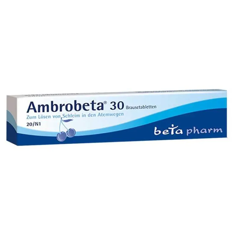 Ambrobeta® 30.Wirkstoff: Ambroxolhydrochlorid. Anw.: Zur schleimlösenden Behandlung bei akuten u. chronischen Erkrankungen der Bronchien u. der Lunge mit zähem Schleim. Warnhinw.: Ambrobeta 30 enth.Lactose. Bitte nehmen Sie Ambrobeta 30 erst nach Rücksprache mit Ihrem Arzt ein, wenn Ihnen bekannt ist, dass Sie unter einer Unverträglichk. gegenüber bestimmten Zuckern leiden. 1 Brausetbl. enth. 29,3 mg Sorbitol. 1 Brausetbl. enth. 0,78 mg Benzylalkohol. Wenn Sie schwanger sind oder stillen oder wenn Sie an einer Leber-oder Nierenerkrankung leiden, fragen Sie Ihren Arzt oder Apotheker um Rat, da sich in Ihrem Körper große Mengen Benzylalkohol anreichern und Nebenwirkungen verursachen können (sog. „metabolische Azidose“). 1 Brausetbl. enth. 126,6 mg Natrium (Hauptbestandteil von Kochsalz/Speisesalz). Dies entspricht 6,3 % der für einen Erw. empfohlenen max. tägl. Natriumaufnahme mit der Nahrung. Zu Risiken und Nebenwirkungen lesen Sie die Packungsbeilage und fragen Sie Ihren Arzt oder Apotheker. betapharm Arzneimittel GmbH, 86156 A