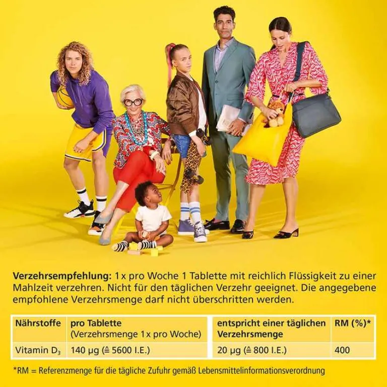 1 Tablette (Tagesportion) enthält 140 μg = 5600 I.E. Vitamin D.