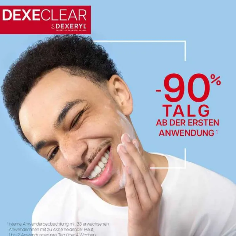Die 2-in-1-Formel reinigt die Haut und reduziert überschüssigen Talg um 90 %¹ bereits nach der ersten Anwendung. Sie bekämpft effektiv Hautunreinheiten und befreit verstopfte Poren. Erhalten Sie eine verfeinerte Hautstruktur mit dem Dexeclear Anti-Unreinheiten schäumenden Gel, welches überschüssigen Tag und Pickel reduziert².