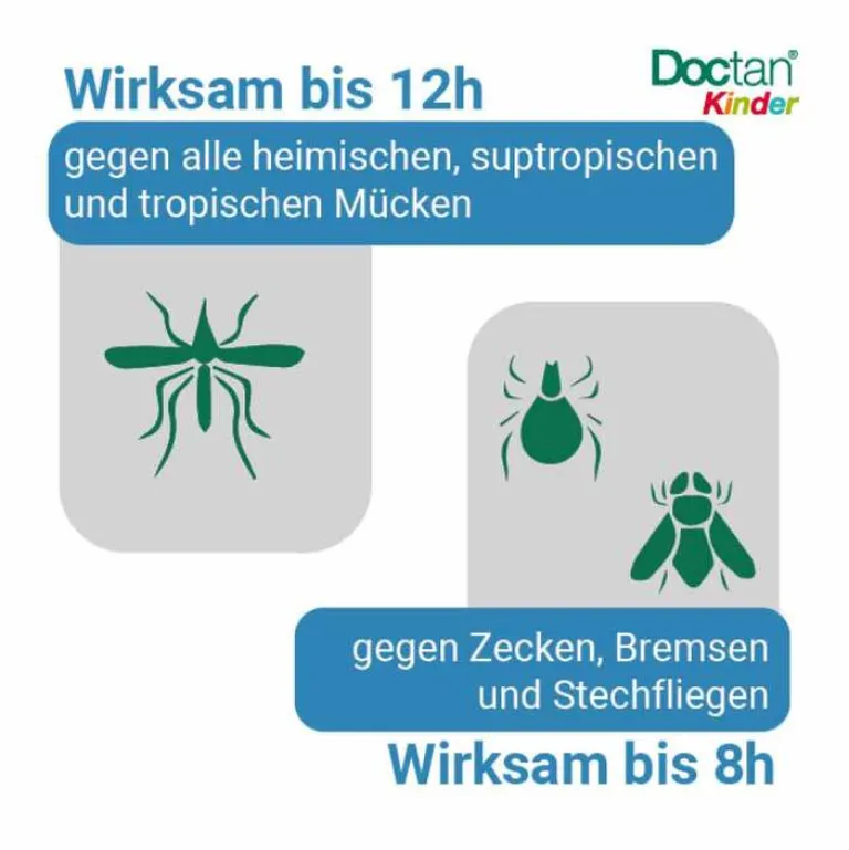 Doctan® Kinder Spray-Lotion schützt vor Stichen von heimischen, tropischen und subtropischen Mücken (Mosquitos), sowie Bissen blutsaugender Insekten wie Zecken, Bremsen und Stechfliegen. Doctan® Kinder ist speziell für Kinder ab 6 Monaten entwickelt. Die Lotion lässt sich leicht verteilen und bildet auf der Haut einen Schutzfilm. Besonders Babys und Kleinkinder im Krabbelalter lieben es die Natur auf allen Vieren zu erkunden. Denken Sie daher rechtzeitig an den Schutz Ihres Nachwuchses vor im Gras und Gebüsch lauernden Zecken und anderen Insekten.