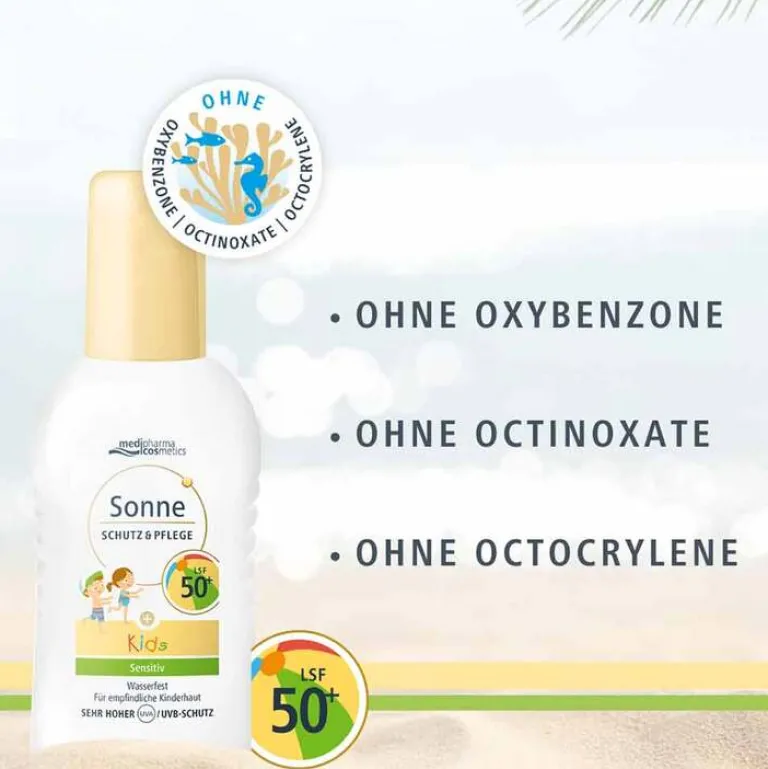 Das wasserfeste Sonnenspray Schutz & Pflege Kids mit LSF 50+ von Medipharma Cosmetics für empfindliche Kinderhaut ist eine leichte Emulsion mit sehr hohem und zuverlässigem Sonnenschutz.