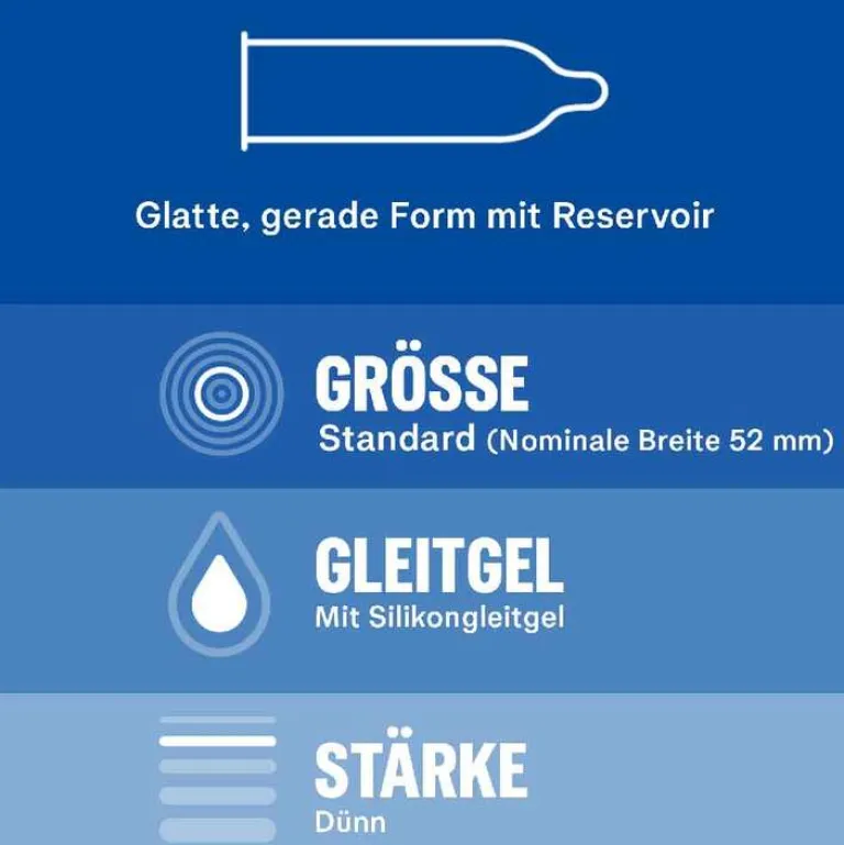 Bitte lesen Sie die Information im Inneren der Packung, insbesondere wenn Sie Kondome für Anal- oder Oralsex verwenden. Denken Sie daran, dass keine Verhütungsmethode zu 100 % vor Schwangerschaft, HIV oder sexuell übertragbare Krankheiten schützt.