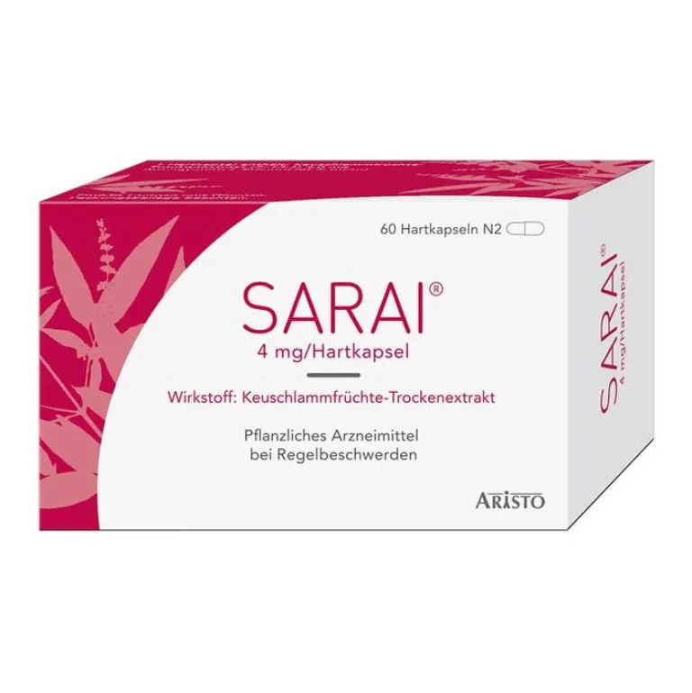 SARAI® 4 mg Hartkapseln. Wirkstoff: Keuschlammfrüchte-Trockenextrakt. Bei Rhythmusstörungen der Regelblutung (Regeltempoanomalien), Spannungs- und Schwellungsgefühl in den Brüsten (Mastodynie), monatlich wiederkehrenden Beschwerden vor Eintritt der Regelblutung (prämenstruelle Beschwerden). Enthält Lactose und Glukose. Packungsbeilage beachten. Zu Risiken und Nebenwirkungen lesen Sie die Packungsbeilage und fragen Sie Ihre Ärztin, Ihren Arzt oder in Ihrer Apotheke. Apothekenpflichtig. (Stand November 2023). Aristo Pharma GmbH, Wallenroder Straße 8-10, 13435 Berlin.