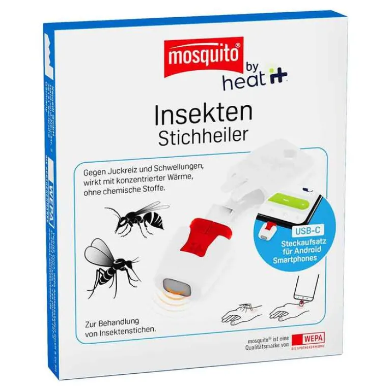 Der mosquito® by heat it Insekten-Stichheiler funktioniert ausschließlich in Verbindung mit einem geeigneten Smartphone und der kostenlosen heat it App. Mit USB C Anschluss für Android Geräte u. I-Phone 15.