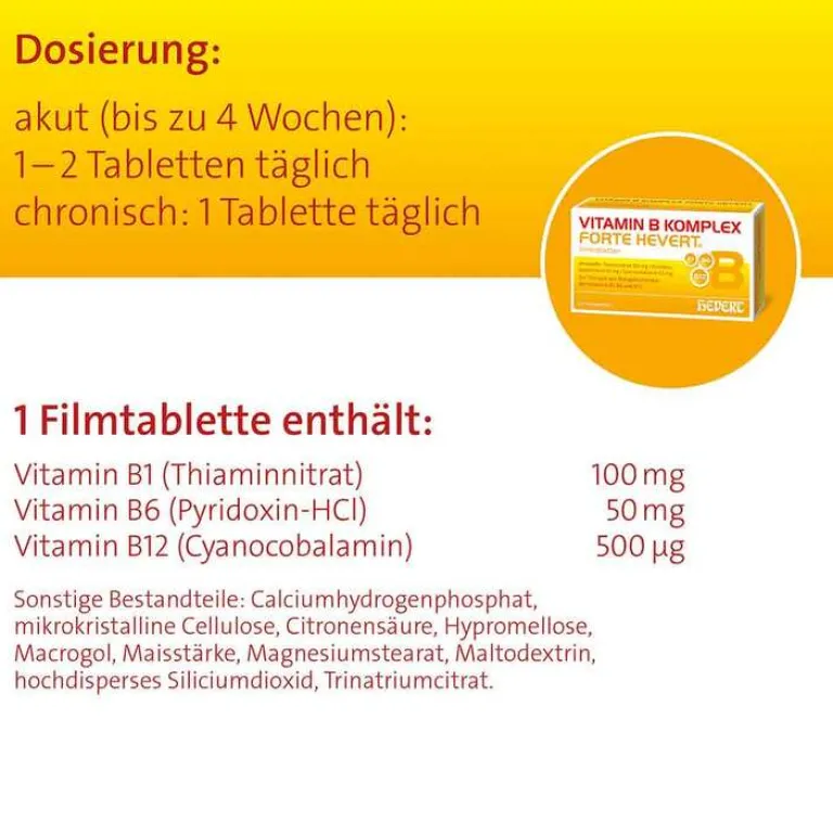Vitamin B Komplex forte Hevert® Anwendungsgebiete: Zur Therapie nachgewiesener Mangelzustände der Vitamine B1, B6 und B12. Zu Risiken und Nebenwirkungen lesen Sie die Packungsbeilage und fragen Sie Ihre Ärztin, Ihren Arzt oder in Ihrer Apotheke.