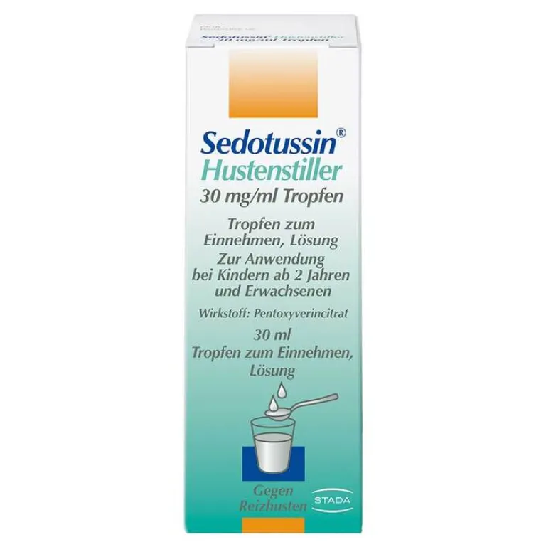 Sedotussin® Hustenstiller 30 mg/ml Tropfen Tropfen zum Einnehmen, Lösung. Zur Anwendung bei Kindern ab 2 Jahren und Erwachsenen. Wirkstoff: Pentoxyverincitrat. Arzneimittel zur symptomatischen Behandlung des Reizhustens (Antitussivum). Enthält Propylenglycol. Zu Risiken und Nebenwirkungen lesen Sie die Packungsbeilage und fragen Sie Ihre Ärztin, Ihren Arzt oder in Ihrer Apotheke. STADA Consumer Health Deutschland GmbH, Stadastraße 2-18, 61118 Bad Vilbel. Stand: August 2021