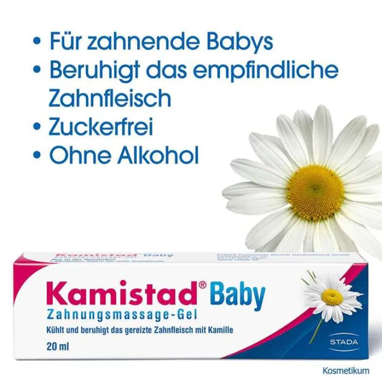 Kamistad® Baby Gel enthält einen Auszug aus Kamillenblüten und Polidocanol. Es pflegt und beruhigt somit das gereizte Zahnfleisch. Zudem enthält es nun auch Hyaluronsäure und ist ohne Alkohol.
