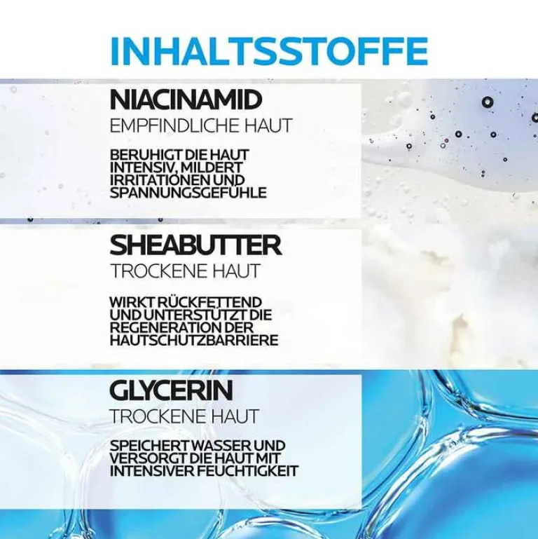 Die Hautcreme enthält beruhigendes Thermalwasser und Karitebutter. Dadurch werden Spannungsgefühle reduziert und die Haut wird vor Feuchtigkeitsverlust geschützt. Weiterer Schutz wird durch eine Glycerin-Formel gewährleistet. Diese bildet sofort eine schützende Barriere auf der Haut und verhindert nachhaltig das Austrocknen besonders empfindlicher Stellen, wie zum Beispiel den Fingerkuppen oder -knöcheln. Diese Funktion wird durch den Inhaltsstoff Niacinamid unterstützt, der vor allem die Beschwerden von geröteten und irritierten Händen mildert.