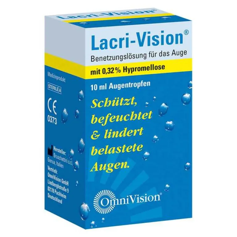 Lacri-Vision® ist eine sterile wässrige Lösung mittlerer Viskosität mit 0,32 % Hypromellose. Lacri-Vision® erfrischt und beruhigt belastete Augen und erhöht ihre Gleitfähigkeit. Lacri Vision® hat eine schützende, befeuchtende Wirkung, die Trockenheitsgefühl auf Grund von Umwelteinflüssen, wie z. B. Klimaanlagen, Tabakrauch, Staub, Reizungen durch Sonneneinstrahlung oder Müdigkeit sowie lange Bildschirmarbeit, rasch und lang anhaltend lindert.