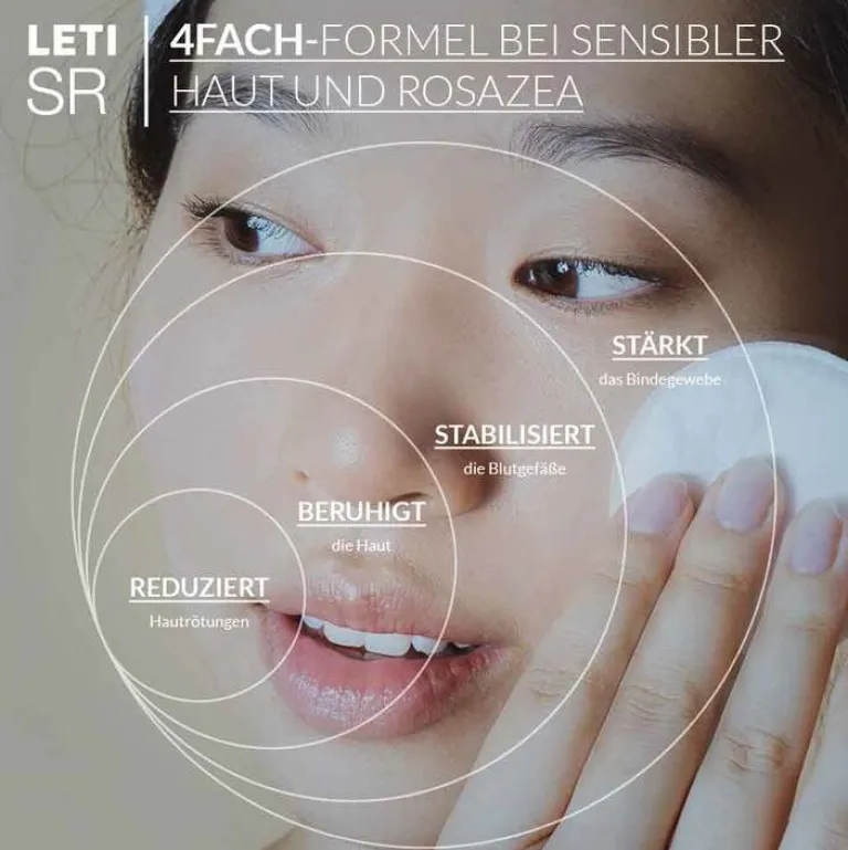 Faktoren wie genetische Veranlagung, Stress oder UV-Strahlung können feinste Blutgefäße (Mikrokapillargefäße) der Haut schwächen und weiten. Dadurch kommt es zu Rötungen im Gesicht, sichtbaren Äderchen oder zu Rosazea. Die aktiven Inhaltsstoffe in LETI SR bieten einen innovativen doppelten Schutz der Blutgefäße. Sie stabilisieren sie und stärken ihr stützendes Bindegewebe (Anti-Aging-Effekt).¹ Das Ergebnis: weniger Rötungen², mehr Straffung. LETI SR wurde speziell für empfindliche und gerötete Haut sowie Rosazea Subtyp I entwickelt.