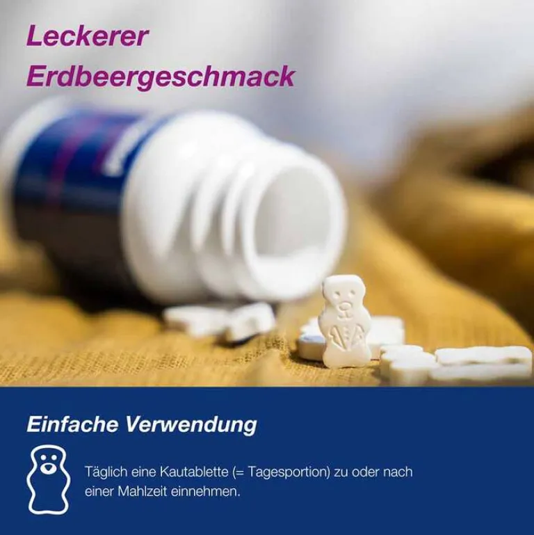 - kindgerechte Darreichungsform als Kautablette mit leckerem Erdbeergeschmack