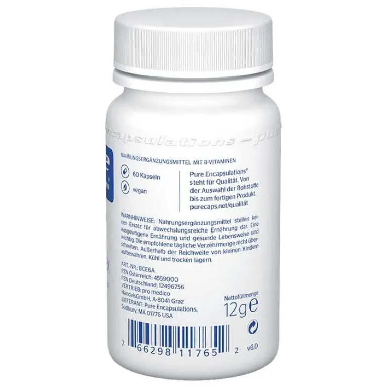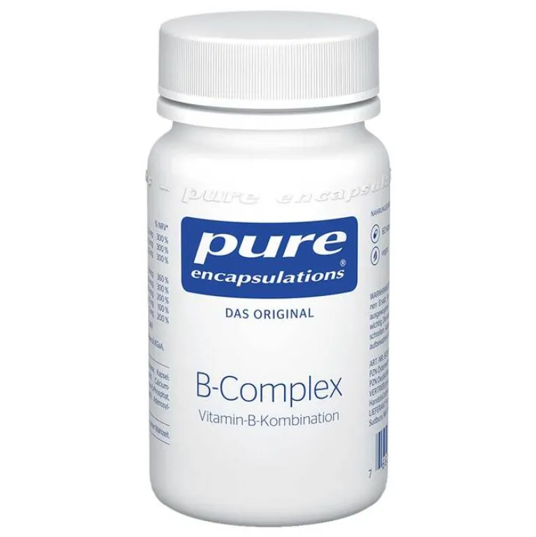 Bei der Zufuhr von B-Vitaminen ist es wichtig, dass diese rasch für die verschiedensten Prozesse verfügbar sind. B-Complex von Pure Encapsulations® erfüllt dieses Kriterium ideal, da auf bereits biologisch aktive Verbindungen zurückgegriffen wird. So trägt beispielsweise Vitamin B6 zu einem normalen Homocystein-Stoffwechsel bei. Die Vitamine B12 und Folsäure (Folat) beteiligen sich in ihrer Coenzym-Form an der Zellteilung und wirken unter anderem am Aufbau der Myelinscheiden, dem Schutzmantel der Nervenbahnen, mit.