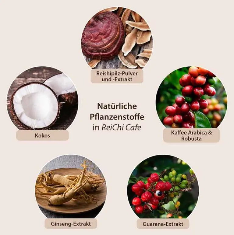 Das Besondere an ReiChi Cafe ist seine einzigartige Komposition aus dem fein-herben Aroma des Reishi-Pilzes, Ginseng, Guarana und Espresso-Kaffee kombiniert mit der mild-cremigen Note von Kokosmilch. Feinste Espresso-Bohnen, sorgfältig ausgewählt und schonend geröstet, verfeinern sein unvergleichliches Aroma.