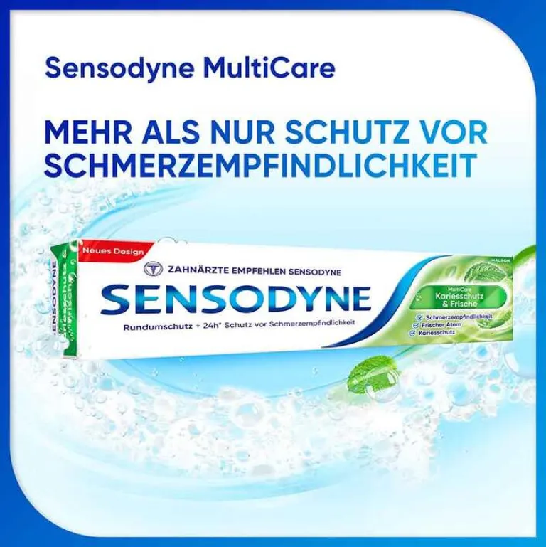 Die tägliche Verwendung einer speziell formulierten Zahncreme kann helfen, die Schmerzempfindlichkeit zu reduzieren. Sensodyne MultiCare Kariesschutz Frische ist eine tägliche Zahnpasta, die klinisch bestätigt 24h Schutz vor Schmerzempfindlichkeit* bietet und extra Frische verleiht.