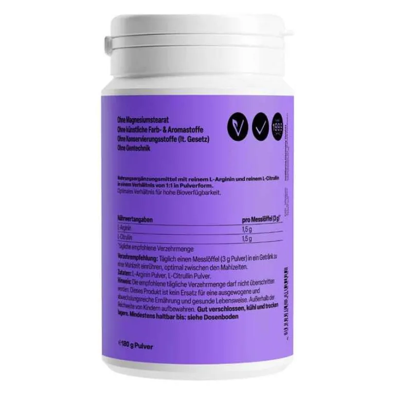 Im L-Arginin + L-Citrullin Pulver werden nur hochwertige und reine Zutaten verwendet. Die Formel verzichtet auf unerwünschte Zusatzstoffe wie Magnesiumstearat und ist zu 100 % vegan. Außerdem ist sie frei von Zucker, Gluten, Laktose und Soja. Um höchste Qualität sicherzustellen, werden Produkt regelmäßigen Prüfungen durch unabhängige deutsche Labore unterzogen. Die Entwicklung und Produktion erfolgen in eigenen Einrichtungen in Nauheim, Hessen, durch erfahrene Pharma-Experten.
