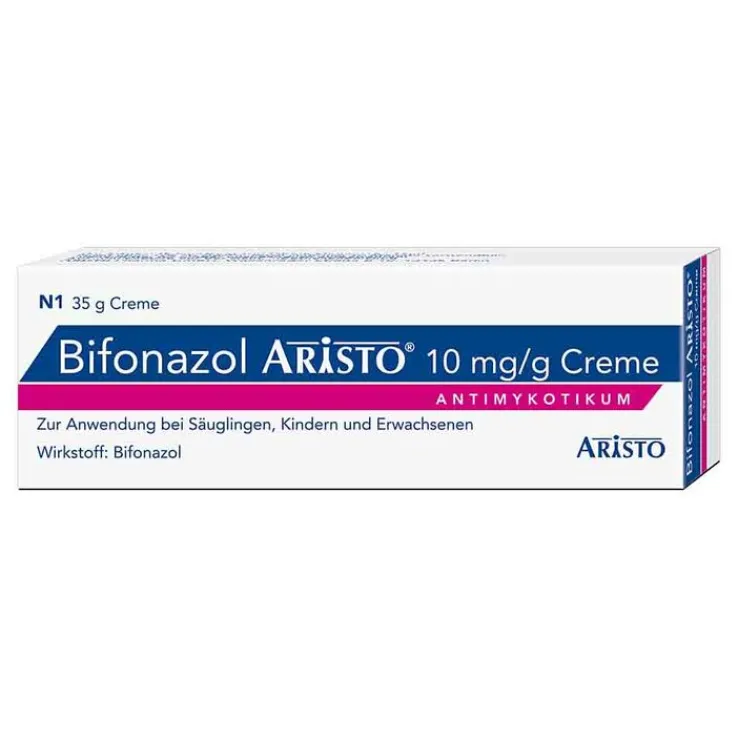 Bifonazol® 10 mg/g Creme. Wirkstoff: Bifonazol. Pilzinfektionen (Mykosen) der Haut, verursacht durch Dermatophyten, Hefen, Schimmelpilze und andere Pilze wie Malassezia furfur sowie Infektionen durch Corynebacterium minutissimum, z. B. Mykosen der Füße und Hände (Tinea pedis, Tinea manuum), der Haut und der Hautfalten (Tinea corporis, Tinea inguinalis), Pityriasis versicolor (sog. Kleienpilzflechte), oberflächliche Candidosen, Erythrasma (Erkrankung der Haut, verursacht durch Corynebacterium minutissimum). Enthält Cetylstearylalkohol (Ph. Eur.). Packungsbeilage beachten. Zu Risiken und Nebenwirkungen lesen Sie die Packungsbeilage und fragen Sie Ihre Ärztin, Ihren Arzt oder in Ihrer Apotheke. Apothekenpflichtig. Aristo Pharma GmbH, Wallenroder Straße 8-10, 13435 Berlin.