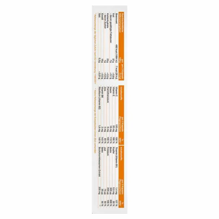 Sonnenblumenöl; Bockshornkleesamen-Extrakt; Gelatine (Rind); Vitamin C; Feucht- haltemittel: Glycerin; Emulgatoren: Lecithine (Raps); Glycerolmonostearat; Vitamin E; Kokosöl; Niacin; Farbstoff: Zuckerkulör; Wasser; Pantothensäure; Zinkoxid; Vitamin B6; Riboflavin; Thiamin; Kupfersulfat; Biotin; Folsäure; Kaliumjodat; Natriumselenat.