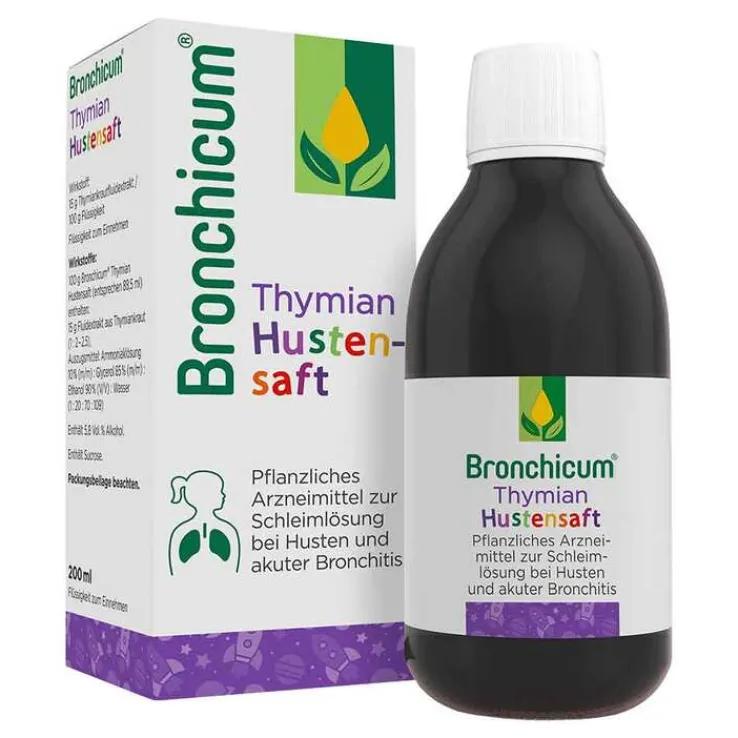 Bronchicum® Thymian Hustensaft. Wirkstoff: Fluidextrakt aus Thymiankraut. Anwendungsgebiete: Zur Besserung der Beschwerden bei Erkältungskrankheiten der Atemwege mit zähflüssigem Schleim und zur Besserung der Beschwerden bei akuter Bronchitis. Warnhinweis: Enthält 5,8 Vol.-% Alkohol. Packungsbeilage beachten. Zu Risiken und Nebenwirkungen lesen Sie die Packungsbeilage und fragen Sie Ihre Ärztin, Ihren Arzt oder in Ihrer Apotheke.