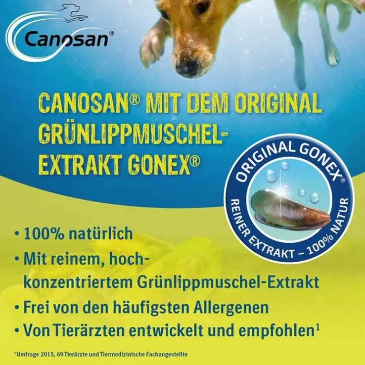 Die besonderen Eigenschaften von Canosan beruhen auf seinem Inhaltsstoff Gonex, welches einen aktiven Grünlippmuschel-Extrakt (GLME) enthält und reich an verschieden Glykosaminoglykanen (GAGs), mehrfach ungesättigten Fettsäuren und besonderen Glykogenkomplexen ist.