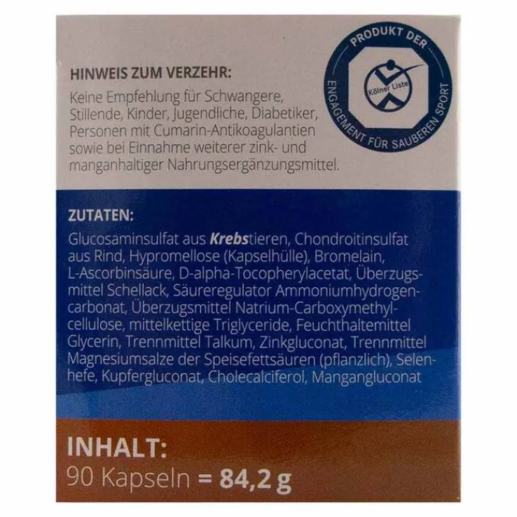 Glucosaminsulfat aus Krebstieren, Chondroitinsulfat aus Rind, Hydroxypropylmethylcellulose, Bromelain, Ascorbinsäure, Trennmittel Magnesiumsalze der Speisefettsäuren (pflanzlich), Überzugsmittel Schellack, Säureregulator Ammoniumcarbonate, Überzugsmittel Natrium-Carboxymethylcellulose, mittelkettige Triglyceride, Feuchthaltemittel Glycerin, Trennmittel Talkum, D-alpha-Tocopherylacetat, Zinkgluconat, Selen-angereicherte Hefe, Kupfergluconat, Cholecalciferol, Mangangluconat.