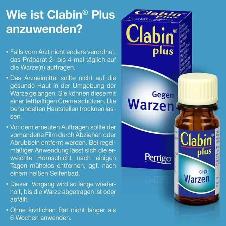 Clabin plus Lösung, Lösung, 15 mlClabin® Plus, 10 g Lösung enthält: Wirkst.: Milchsäure (Ph.Eur.) 1,67 g; Salicylsäure (Ph.Eur.) 1,67 g; Sonst. Bestandt.: Elastisches Collodium (bestehend aus: Ethanol, Ether, Pyroxylin, Kolophonium, Rizinusöl). Anw.: Zur äußerlichen Behandlung von Warzen. Gegenanz.: Überempfindlichkeit gg. Salicylsäure, Milchsäure, Salicylate oder sonst. Bestandt.; nicht bei Säuglingen oder Patienten mit Niereninsuffizienz, bei stillenden Müttern (bei regelm. Behandlung großer Hautflächen); Nebenw.: gelegentlich leichtes, bei häufigerem Auftragen auch stärkeres Brennen bes. auf der die Warze umgeb. Haut; sehr selten: allergische Kontaktdermatitis, Teleangiektasien, braune Flecken, Photosensibilisierung, Dermatitis, Verdünnung der oberen Hautschichten, Pigmentierung, Depigmentierung. Perrigo Deutschland GmbH, Königstraße 26, DE-70173 Stuttgart Stand: Juni 2023