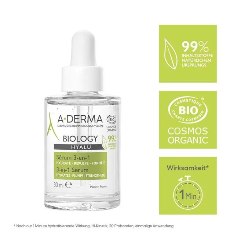Das A-Derma Biology Hyalu Serum 3 in 1 ist eine duale Hydratation in Epidermis und unterer Epidermis. Es hält die Feuchtigkeit bis zu 72 Std. lang in der Haut.** Das Serum ist mit Anti-Pollution-Effekt und enthält nur 9 Inhaltsstoffe, 99% der Inhaltsstoffe sind natürlichen Ursrungs. Es kommt ohne Duftstoffe aus und wurde an allergischer Haut unter dermatologischer und ophthalmologischer Kontrolle getestet.