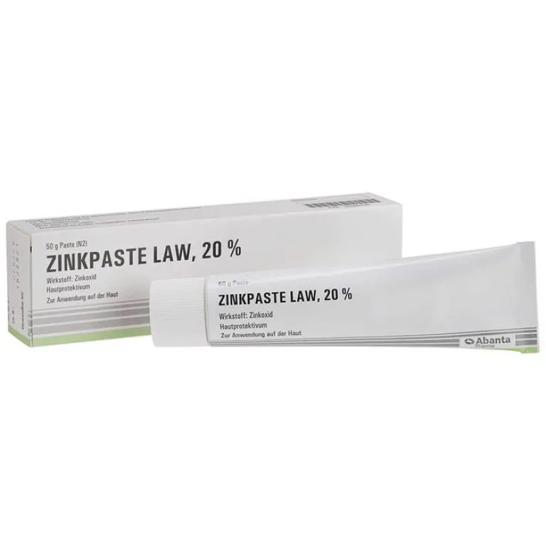 ZINKPASTE LAW, 20 %. Wirkstoff: Zinkoxid. Anwendungsgebiet: Zinkoxid wirkt abdeckend-protektiv und sekretbindend bei akuten und subakuten Dermatosen. Warnhinweise: enthält Butylhydroxytoluol und Wollwachs. Apothekenpflichtig. Zu Risiken und Nebenwirkungen lesen Sie die Packungsbeilage und fragen Sie Ihre Ärztin, Ihren Arzt oder in Ihrer Apotheke. Abanta Pharma GmbH