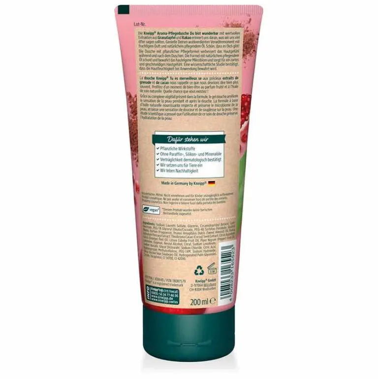 Die Kneipp Aroma-Pflegedusche Du bist wunderbar mit wertvollen Extrakten aus Granatapfel und Kakao erinnert uns daran, was wir uns viel öfter sagen sollten. Genießen Sie Ihren wohlverdienten Verwöhnmoment mit fruchtigem Duft und natürlichem pflegendem Öl. Schön, dass es Sie gibt!