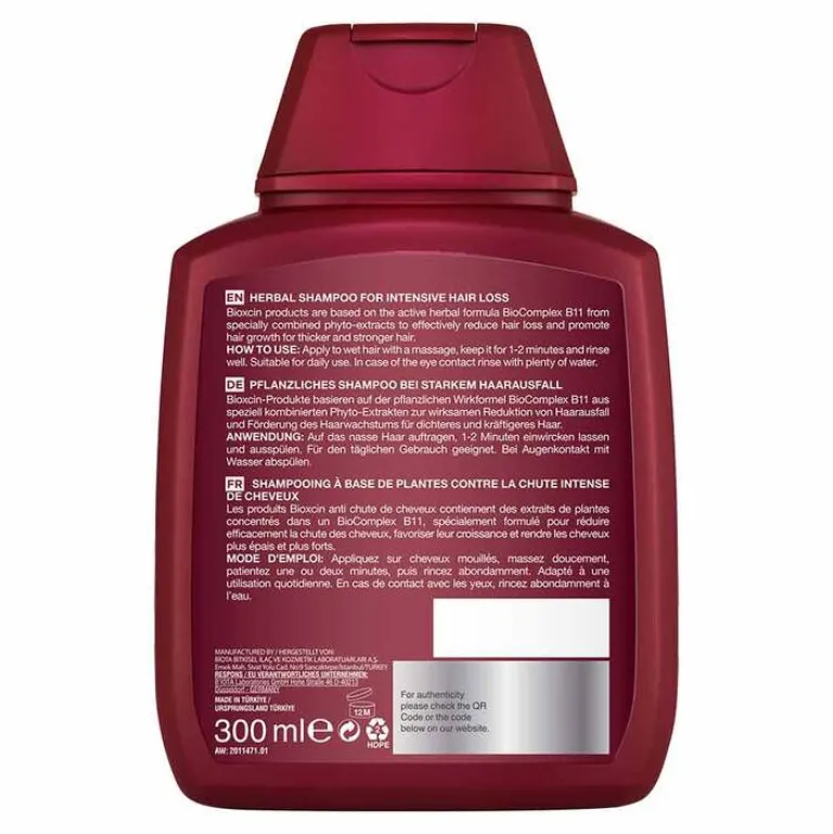 Bioxsine Forte Shampoo basiert auf der aktiven Kräuterformel BioComplex B11 aus speziell kombinierten Phyto-Extrakten zur effektiven Reduzierung von Haarausfall und Förderung des Haarwachstums für dickeres und kräftigeres Haar.