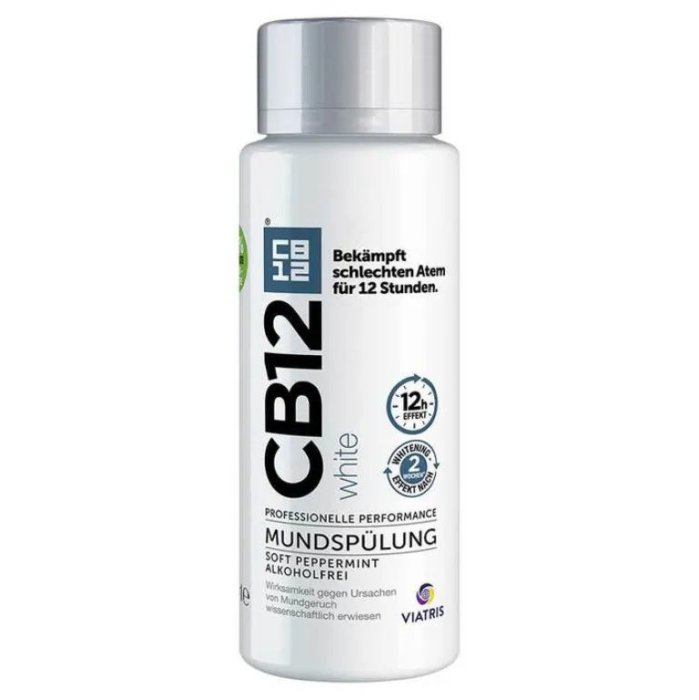 CB12 White. Für 12 Stunden angenehmen Atem und weißere Zähne in 2 Wochen. Reduzieren Sie bestehende und beugen Sie neuen Verfärbungen vor. Stärken Sie zusätzlich Ihre Zähne durch das enthaltene Fluorid.