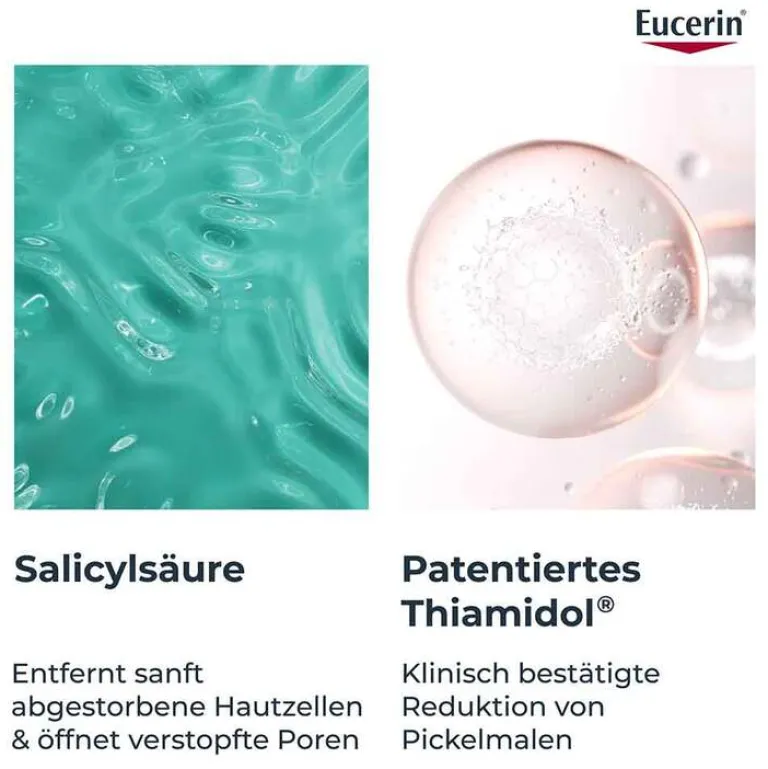Die Eucerin® DERMOPURE CLINICAL Triple Action 3-fach tiefenwirksame Pflege 40 ml korrigiert die wichtigsten Anzeichen fettiger, zu Akne neigender Haut: Pickel, Mitesser und Pickelmale. Die einzigartige und konzentrierte Formel der Gesichtscreme kombiniert 2% Salicylsäure mit patentiertem Thiamidol® für ein klareres, strahlenderes Hautbild.
