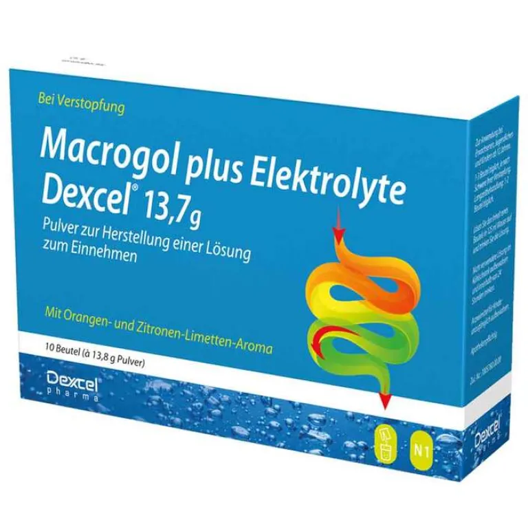 Macrogol plus Elektrolyte Dexcel® 13,7 g Pulver zur Herstellung einer Lösung zum Einnehmen. Wirkstoffe: Macrogol 3350, Natriumchlorid, Natriumhydrogencarbonat, Kaliumchlorid Anwendungsgebiete: chronische Verstopfung bei Erwachsenen und Kindern ab 12 Jahren. Hinweis: Hoher Natriumgehalt. Enthält Sorbitol und Kalium. Zu Risiken und Nebenwirkungen lesen Sie die Packungsbeilage und fragen Sie Ihren Arzt oder Apotheker. Dexcel® Pharma GmbH, 63755 Alzenau Stand: November 2022.