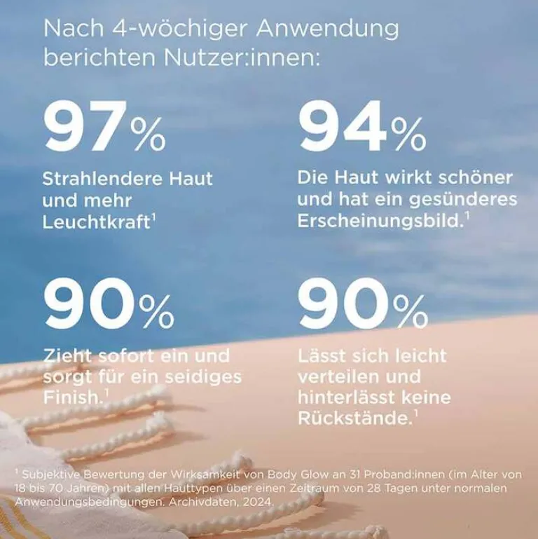 ¹ Subjektive Bewertung der Wirksamkeit von Body Glow an 31 Probanden (18–70 Jahre) mit allen Hauttypen über 28 Tage unter normalen Anwendungsbedingungen. Daten vorliegend, 2024.
