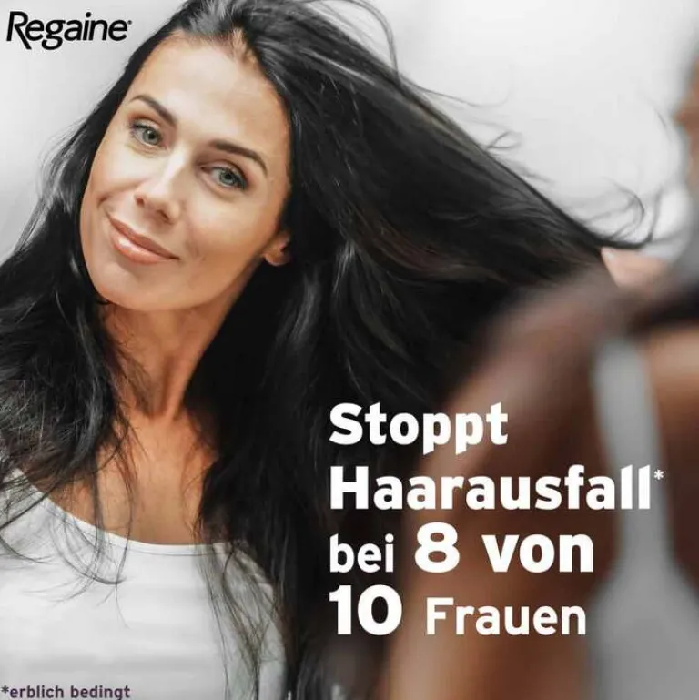 Regaine® Frauen Schaum. Wirkstoff: Minoxidil. Anwendungsgebiete: Regaine® Frauen Schaum stabilisiert bei Frauen den Verlauf der androgenetischen Alopezie vom weiblichen Typ (charakteristische anlagebedingte diffuse Kopfhaarverdünnung im Scheitelbereich). Die Behandlung mit Regaine® Frauen Schaum fördert das Haarwachstum u. kann so dem Fortschreiten dieses Haarverlustes entgegenwirken. Zu Risiken und Nebenwirkungen lesen Sie die Packungsbeilage und fragen Sie Ihre Ärztin, Ihren Arzt oder in Ihrer Apotheke. Johnson & Johnson GmbH, 41470 Neuss. Stand: 07/2023
