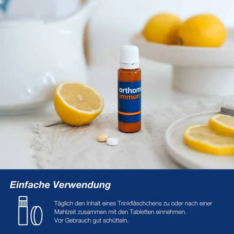 Orthomol Immun Trinkfläschchen/Tabletten Kombipackung ist ein Nahrungsergänzungsmittel. Es enthält wichtige Mikronährstoffe für das Immunsystem, wie z.B. Vitamin A, Folsäure, Vitamin B6, Vitamin B12, Vitamin C, Vitamin D, Selen, Eisen, Kupfer und Zink.* Vitamin C, Vitamin E, Riboflavin (Vitamin B2), Zink, Selen, Kupfer und Mangan tragen dazu bei, die Zellen vor oxidativem Stress zu schützen.