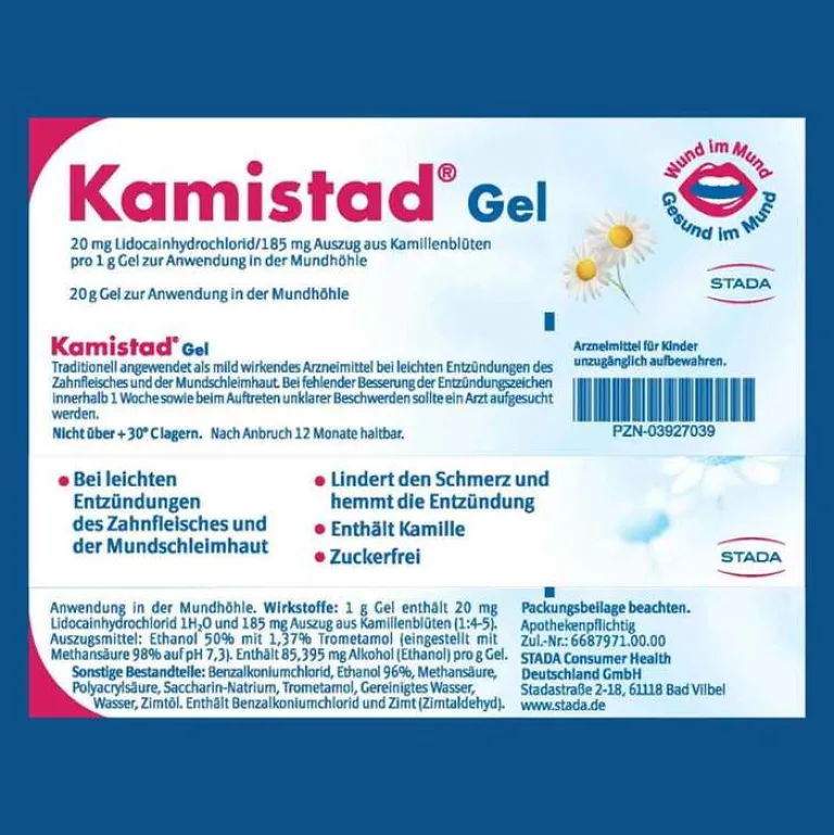Kamistad® Gel 20 mg Lidocainhydrochlorid/185 mg Auszug aus Kamillenblüten pro 1 g Gel zur Anwendung in der Mundhöhle. Wirkstoffe: Lidocainhydrochlorid und Auszug aus Kamillenblüten. Zur Behandlung von leichten Entzündungen des Zahnfleisches und der Mundschleimhaut. Bei fehlender Besserung der Entzündungszeichen innerhalb 1 Woche sowie beim Auftreten unklarer Beschwerden sollte ein Arzt aufgesucht werden. Enthält Benzalkoniumchlorid und Zimt (Zimtaldehyd). Zu Risiken und Nebenwirkungen lesen Sie die Packungsbeilage und fragen Sie Ihre Ärztin, Ihren Arzt oder in Ihrer Apotheke. STADA Consumer Health Deutschland GmbH, Stadastraße 2–18, 61118 Bad Vilbel. Stand: August 2020