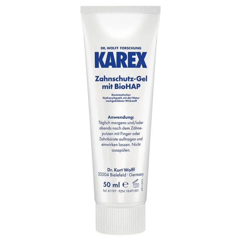 * Das Karex Zahnschutz-Gel enthält den zahnverwandten Wirkstoff BioHAP*. Das steht für Biomimetischer Hydroxylapatit – der Stoff, aus dem unsere Zähne gemacht sind. Ca. 97% unseres Zahnschmelzes und ca. 70% unseres Dentins bestehen aus Hydroxylapatit. Die Wirksamkeit von BioHAP* in der Zahnpflege wurde in wissenschaftlichen Studien nachgewiesen.