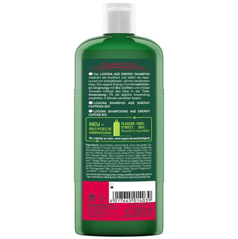 Das Logona Age Energy Shampoo Bio-Coffein vitalisiert die Kopfhaut und stärkt die Haarwurzel von energielosem, dünner werdendem Haar. Die vegane Energy-Formel natürlichen Ursprungs mit Bio-Coffein und milden Tensiden kräftigt das Haar in der Tiefe.