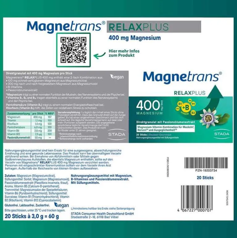 Magnesium (Magnesiumcitrat), Süßungsmittel: Sorbit; Magnesium (Magnesiumoxid), Passionsblumenextrakt (Passiflora incarnata, Kraut), Aroma, Vitamin B5 (Calcium-D-pantothenat), Trennmittel: Magnesiumsalze der Speisefettsäuren, Vitamin B6 (Pyridoxinhydrochlorid), Süßungsmittel: Sucralose; Vitamin B1 (Thiaminhydrochlorid), Vitamin B2 (Riboflavin), Vitamin B12 (Cyanocobalamin).