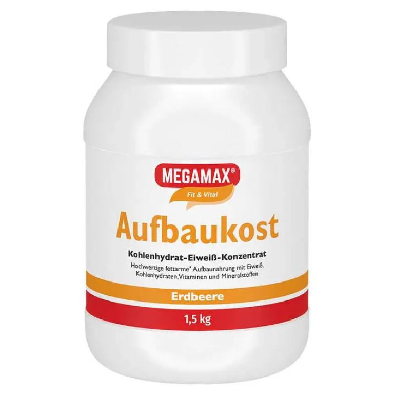 Megamax Aufbaukost ist eine fettarme und leicht verzehrbare Aufbaunahrung mit vielen lebenswichtigen Nährstoffen. Die Aufbaunahrung enthält Eiweiß, Kohlenhydrate, Vitamine und Mineralstoffe. Die im Produkt enthaltenen Proteine tragen zu einer Zunahme und zur Erhaltung von Muskelmasse und zur Erhaltung normaler Knochen bei. Die Mineralstoffe Calcium und Magnesium sorgen zudem in Verbindung mit den Vitaminen B6, B12, Pantothensäure und Niacin für einen normalen Energiestoffwechsel. B-Vitamine unterstützen das Nervensystem und sorgen für normale psychische Funktionen. Biotin, Niacin, Riboflavin leisten einen Beitrag zur Erhaltung gesunder Schleimhäute. Hauptbestandteil der Aufbaunahrung sind Kohlenhydrate.
