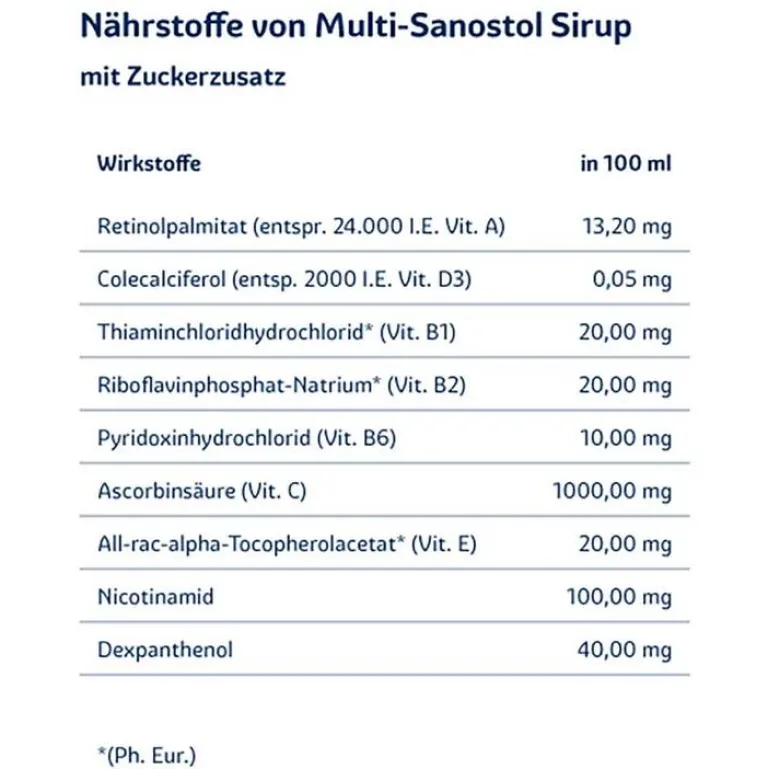 multi-sanostol®, Sirup Anwendungsgebiete: multi-sanostol® ist ein Multivitaminpräparat zur Vorbeugung von kombinierten Vitaminmangelzuständen. Hinweis: multi-sanostol® ist nicht geeignet zur Vorbeugung von Vitaminmangelzuständen, die mit einer gestörten Aufnahme aus dem Darm einhergehen. Zur gezielten Vorbeugung eines Mangels eines bestimmten Vitamins werden höher dosierte Monopräparate empfohlen. Enthält Saccharose, Glucose und Natriumbenzoat. Zu Risiken und Nebenwirkungen lesen Sie die Packungsbeilage und fragen Sie Ihre Ärztin, Ihren Arzt oder in Ihrer Apotheke. Stand: 12/2023