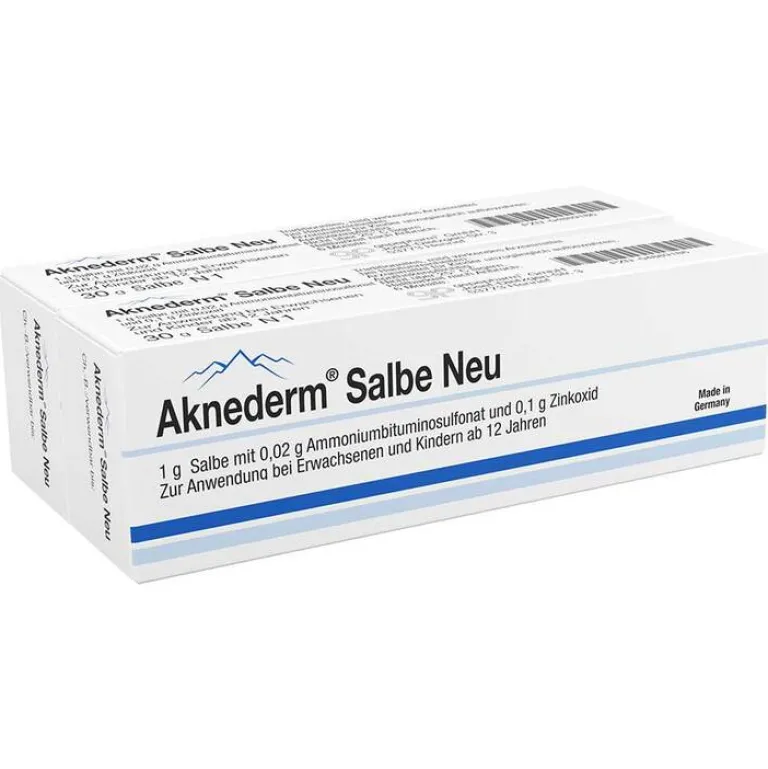 Aknederm® Salbe Neu Wirkstoff: Ammoniumbituminosulfonat und Zinkoxid. Anwendungsgebiete: Aknederm Salbe Neu ist ein traditionelles Arzneimittel. Aknederm Salbe Neu wird angewendet als mild wirkendes Arzneimittel bei Hautunreinheiten. Aknederm Salbe Neu wird angewendet bei Erwachsenen und Kindern ab 12 Jahren. Hinweis: Sollten die Hautunreinheiten sich nicht bessern oder sollten Entzündungen im Anwendungsbereich auftreten, ist der Arzt aufzusuchen. Warnhinw: Enthält Methyl-4-hydroxybenzoat. Enthält Cetylstearylalkohol. Packungsbeilage beachten! Methyl-4-hydroxybenzoat kann Überempfindlichkeitsreaktionen, auch Spätreaktionen, hervorrufen. Zu Risiken und Nebenwirkungen lesen Sie die Packungsbeilage und fragen Sie Ihre Ärztin, Ihren Arzt oder in Ihrer Apotheke. gepepharm GmbH