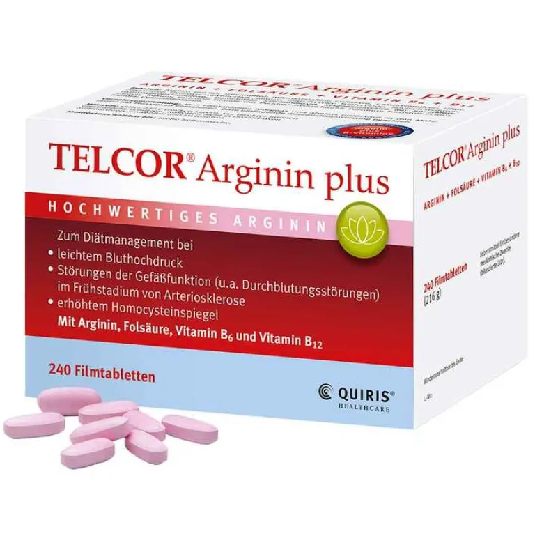 Telcor® Arginin plus ist ein Lebensmittel für besondere medizinische Zwecke (bilanzierte Diät) und mit seiner speziellen Nährstoffkombination zum Diätmanagement bei leichtem Bluthochdruck, Störungen der Gefäßfunktion (u.a. Durchblutungsstörungen) im Frühstadium von Arteriosklerose sowie erhöhtem Homocysteinspiegel geeignet. Bei Bluthochdruck und Durchblutungsstörungen im Frühstadium von Arteriosklerose besteht oft krankheitsbedingt ein spezifischer Mangel an Arginin, der sehr oft auch mit Mangelzuständen der Vitamine B6, B12 und Folsäure einhergeht. Fehlen diese B-Vitamine, sind häufig die Homocysteinkonzentrationen im Blut erhöht.