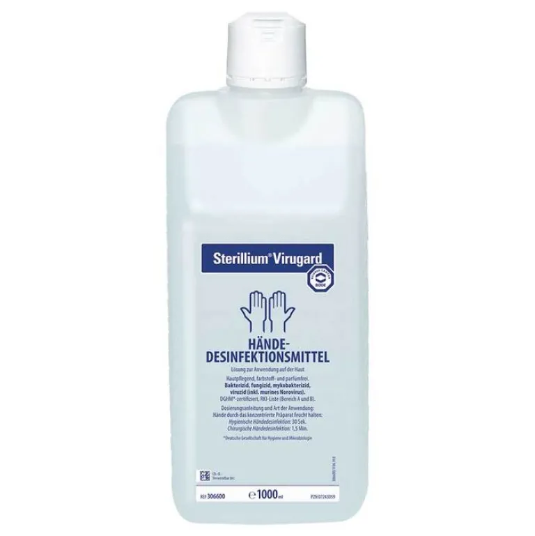 Sterillium® Virugard®. Wirkstoff: Ethanol. Anwendungsgebiete: Hygienische und chirurgische Händedesinfektion. Warnhinweise: Nicht in Kontakt mit offenen Flammen bringen. Nicht in der Nähe von Zündquellen verwenden. Flasche nach Gebrauch verschließen. Flammpunkt nach DIN 51755: 0 °C. Leicht entzündlich. Elektrostatische Aufladung vermeiden. Mit alkoholnassen Händen nichts berühren. Nach Verschütten des Desinfektionsmittels sind folgende Maßnahmen zu treffen: Sofortiges Aufnehmen der Flüssigkeit, Verdünnen mit viel Wasser, Lüften des Raumes sowie das Beseitigen von Zündquellen. Nicht rauchen. Ein etwaiges Umfüllen darf nur unter aseptischen Bedingungen (Sterilbank) erfolgen. Zu Risiken und Nebenwirkungen lesen Sie die Packungsbeilage und fragen Sie Ihre Ärztin, Ihren Arzt oder in Ihrer Apotheke. BODE Chemie GmbH, Melanchthonstraße 27, 22525 Hamburg