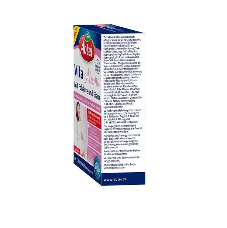 Abtei Vita Mama enthält eine speziell abgestimmte Nährstoffkombination mit Folsäure, Eisen, Jod und 19 weiteren wertvollen Vitaminen und Mineralstoffen die zu einer umfassenden Versorgung in diesen herausfordernden, aber einzigartig schönen Zeiten beitragen.